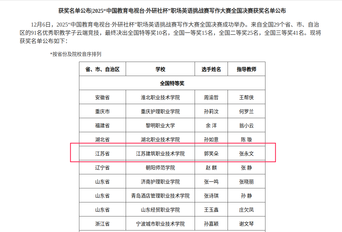 2025“中国教育电视台・外研社杯”职场英语挑战赛江苏赛区比赛于2025年11月9日在江苏经贸职业技术学院圆满收官。我校高度重视此次赛事,组建了由张永文、章妍、史胜翠、白杨等四人组成的指导教师团队,经过层层选拔,派出6名选手参赛。在高强度的比拼中,我校学子凭借扎实的英语功底、出色的职场应用能力和稳定的现场发挥脱颖而出,创下我校在此项赛事中的最佳战绩,实现历史性突破。在写作比赛中,郭笑朵同学荣获省赛特等奖,臧文清、陈怡萱同学分别荣获省赛二、三等奖。郭笑朵同学于12月6日代表江苏省出征全国总决赛,获得全国特等奖。演讲比赛赛场同样捷报频传,孙顾涵荣获省赛一等奖,岳星彤、汤司晨同学荣获省赛三等奖。